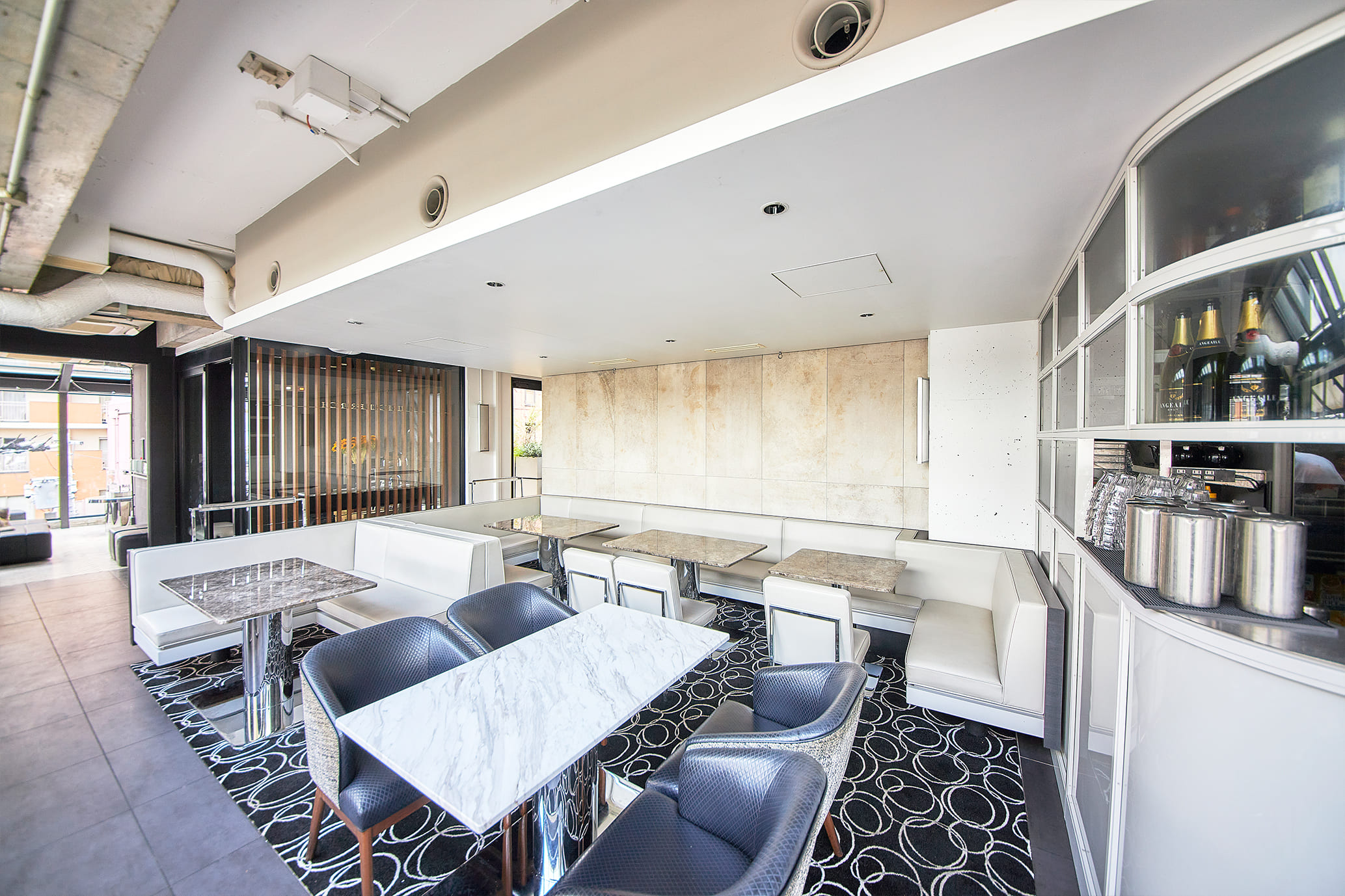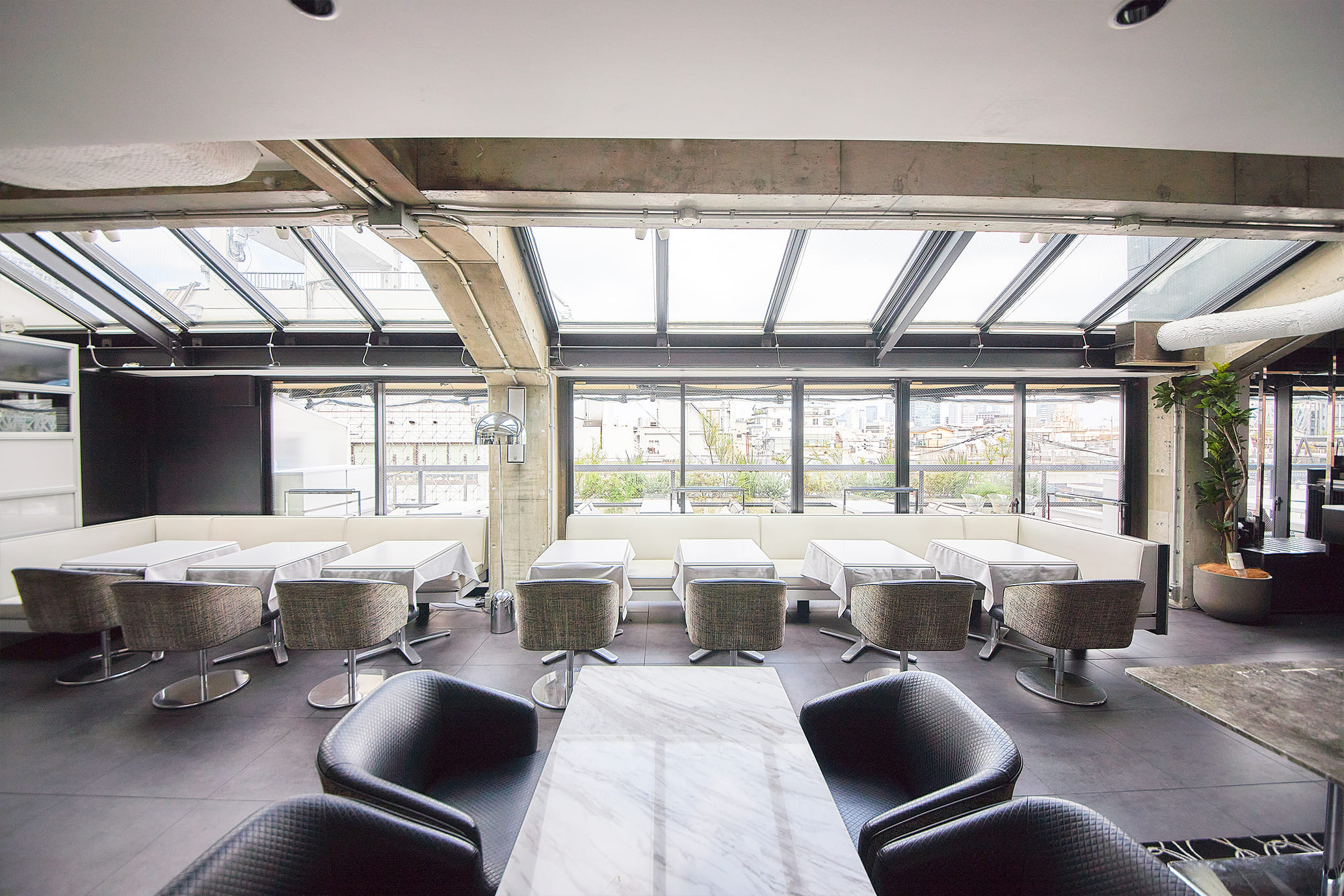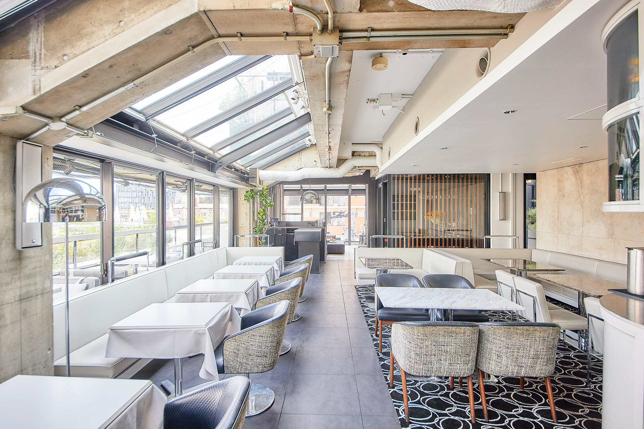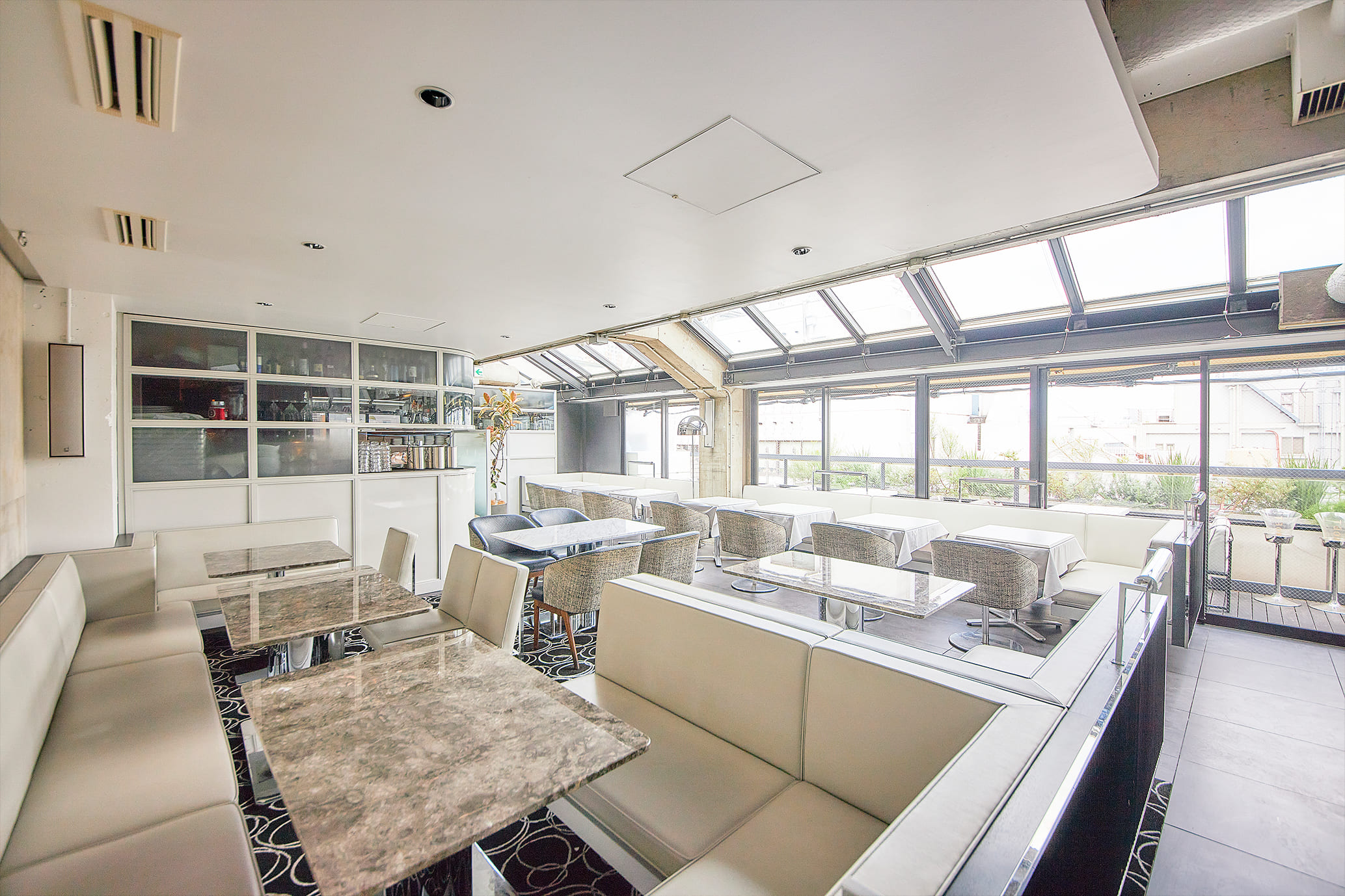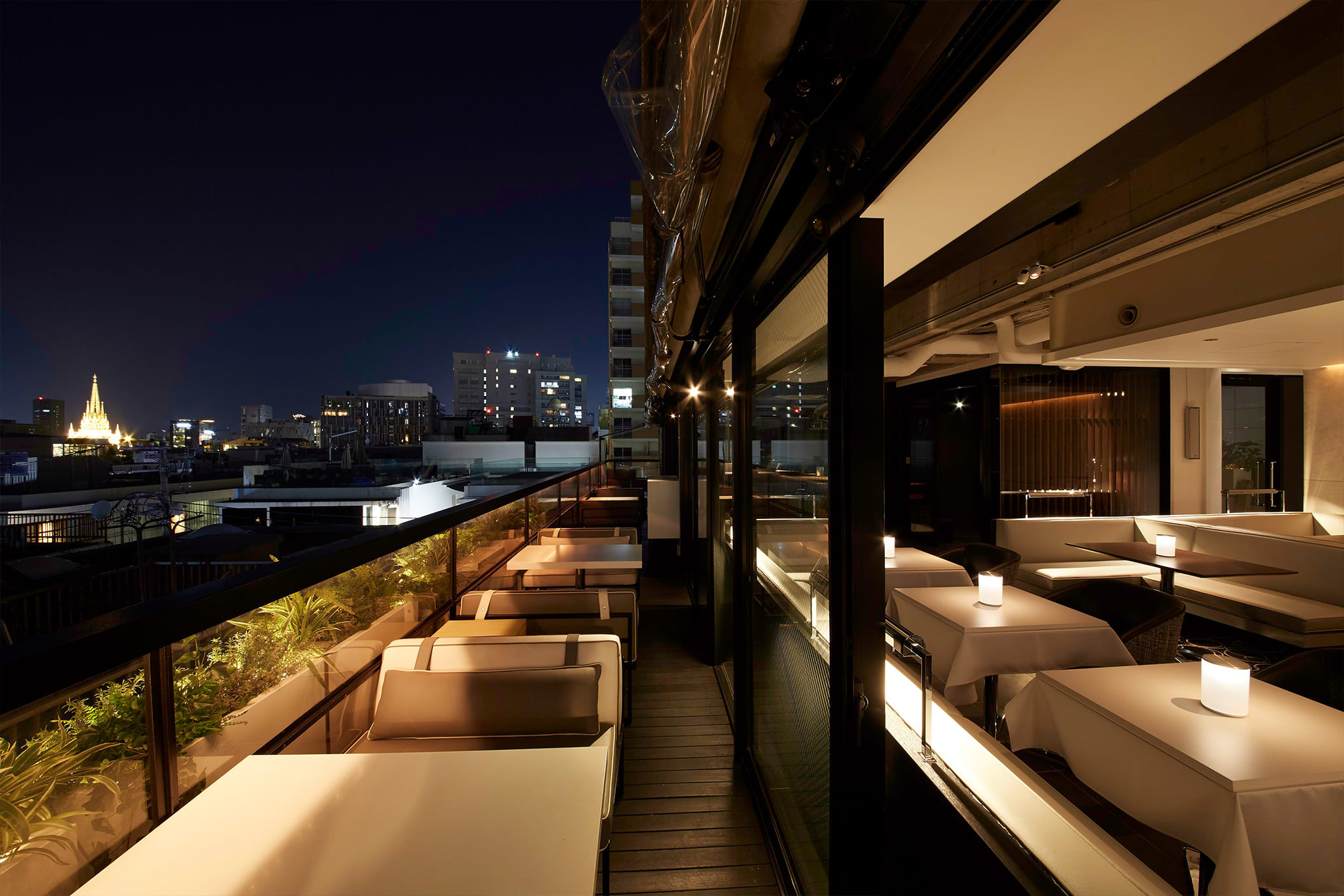 デザイナーズビルの最上階に位置し、 一面ガラス張りの開放的な店内は、 昼には光が差し込んでランチタイムを爽快に演出。 夜には夜景が望め、また違った表情を見せる。 白を基調にした家具は、すべてN.Y.「MEGU」を手掛けたチームにフルオーダー。 ハイセンスな空気を肌で感じて…